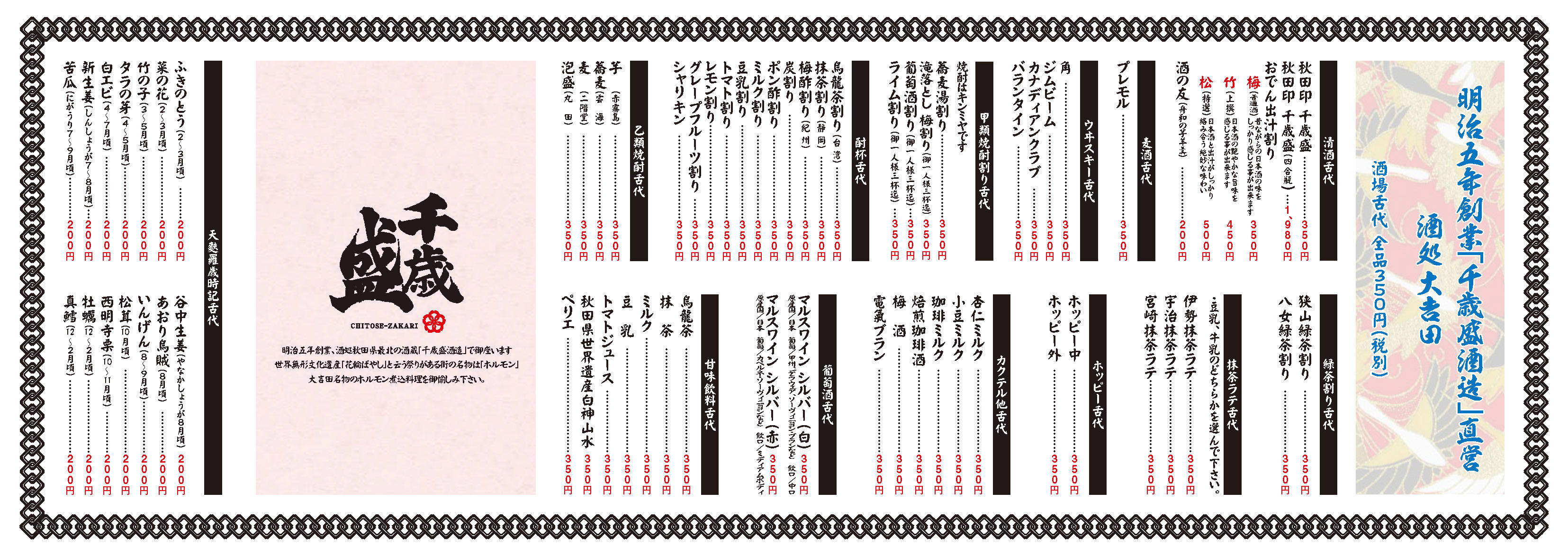 大吉田の日本酒は秋田県の千歳盛(ちとせざかり)。秋田県の北東の端、青森・岩手との県境に位置する鹿角市に所在する、創業明治5年の酒蔵です。鹿角地域は昼と夜の寒暖差が多く米の栽培適地であり山々に囲まれているため豊富な天然水に恵まれております。良い米と良い水を北国秋田の中でも群を抜いた厳寒な地域鹿角で丁寧にじっくりと時間をかけて仕込まれたお酒です。